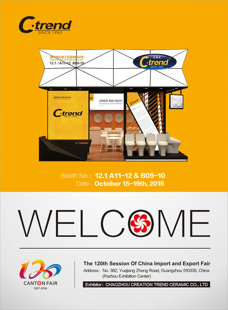 The 120th session of China Import and Export Fair will be held in Pazhou exhibition center from Oct.15, 2016. Chaozhou Creation Trend Ceramic Co., ltd (Hereinafter referred to as the “C. trend”) will attend this fair as ever and the booth No. is 12.1 A11-12 & B09-10.